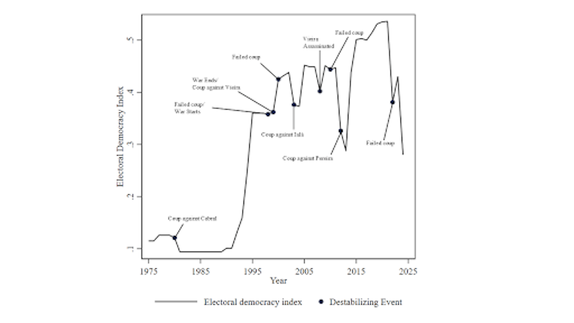 The country has fallen in the Electoral Democracy Index, provided by the Varieties of Democracy (V-Dem). As shown in the graph below, the decline even outpaces the drop witnessed after military coups in 2003, 2012, and the assassination of Vieira in 2009.